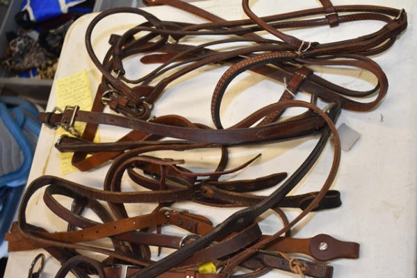#961 – Circle Y rolled show halter, Circle Y raised scallop breast collar with silver conchos accents, 4 running martingale tie downs, patent leather breast collar, padded breast collar, floral tooled breast collar, new slobber straps, 3 1-ear leather wood brow band leather head stall, buckle check pieces, bucking strap, gaming rein, leather, new nylon halter, tie down, back cinch, attachment leather