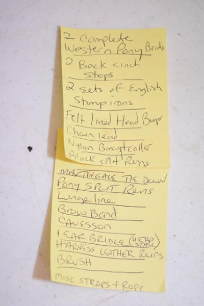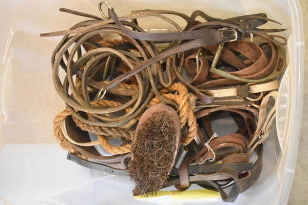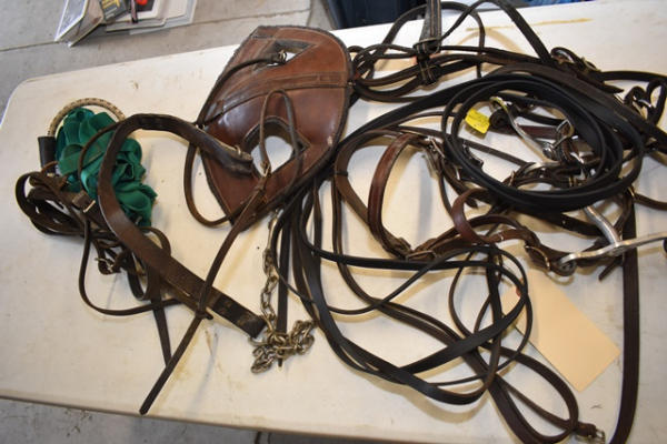 #965 – Lot of 2 complete western pony bridles, 2 back cinch straps, 2 sets of English stirrup irons, throat line head bumper, chain lead, nylon breast collar, black split reins, martingale tie down, pony split reins, lunge line, brow band, cavesson 1-ear bridle headstall, harness leather reins, brush, misc. straps and rope