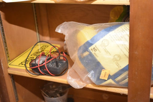Cabinet contents consisting of fence pliers, gate handles, U-post insulators, T-post toppers, wood post insulators, safe fence corner insulators, etc.