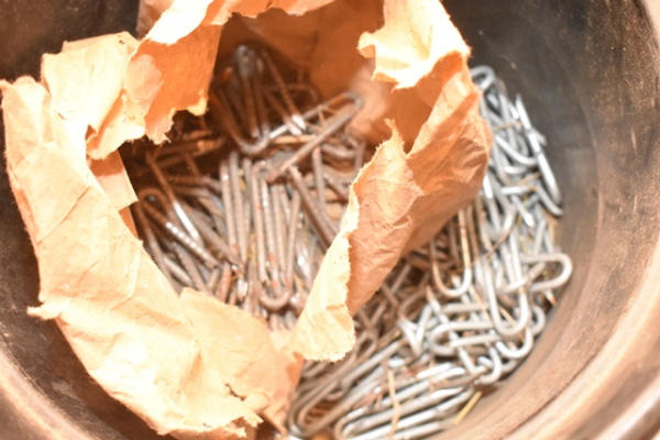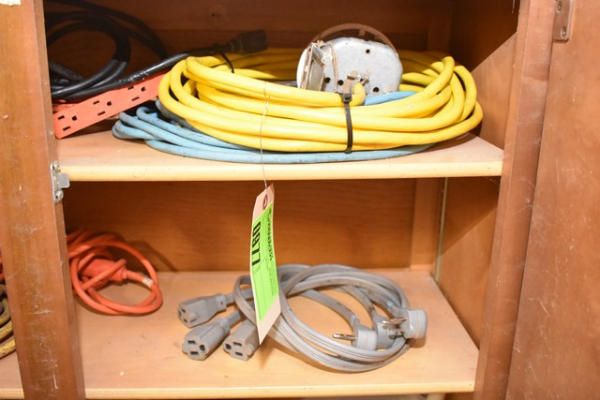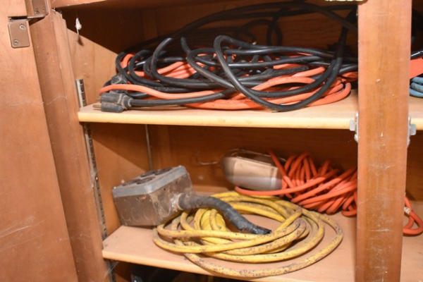 Cabinet contents consisting of 7 extension cords, 2 boxes of insulation supports, pail with U-shaped fence staples, spool of hot wire, partial spool of wire