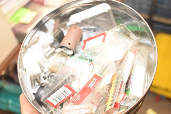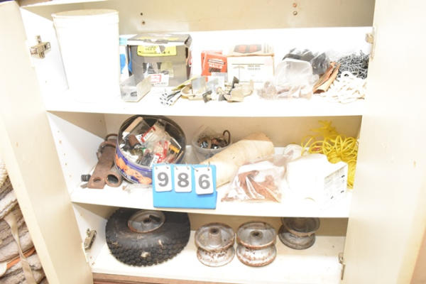 Contents of cabinet including wheel, hubs, PVC fence toppers, string, various chain boxes, tubs and nails, toggle bolts, etc.