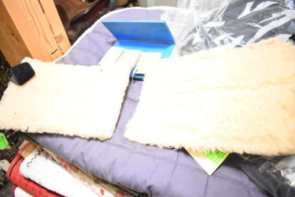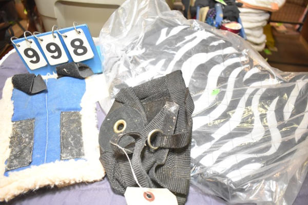 Mini zebra stripe English saddle pad, grazing muzzle and 1 pair of shipping boots