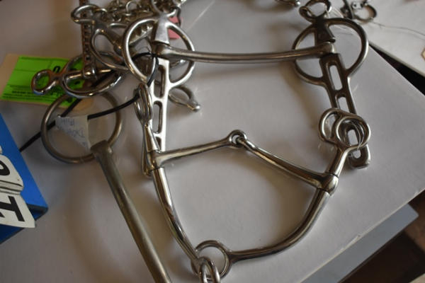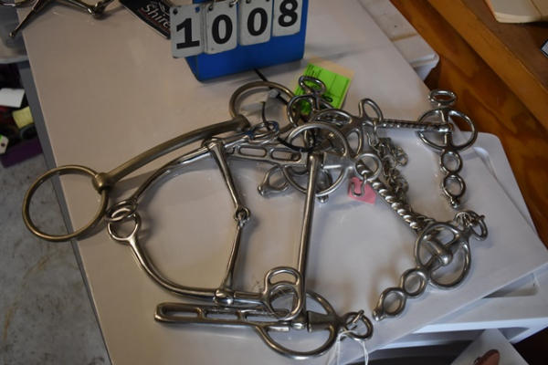 Lot of 5 6 1/2" and 6 1/4" draft horse bits including 3 different types of connections including western riding pelham, 3 driving bits and a straight bar English or Western bit