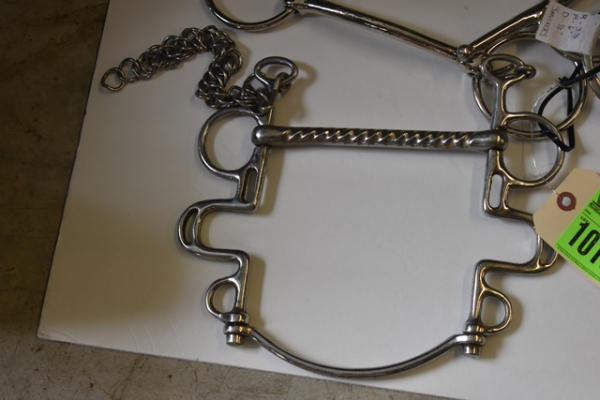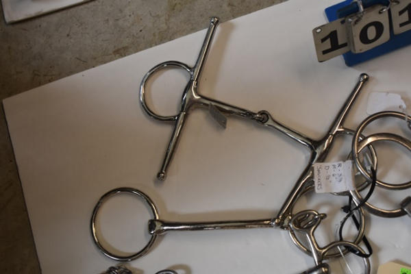 Lot of 6" and 6 1/4" bits including straight mouth bar, English full cheek snaffle, O-ring slow twist, O-ring loose ring, and a large draft horse bit with hard bar spacer