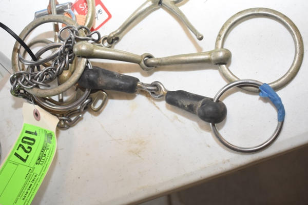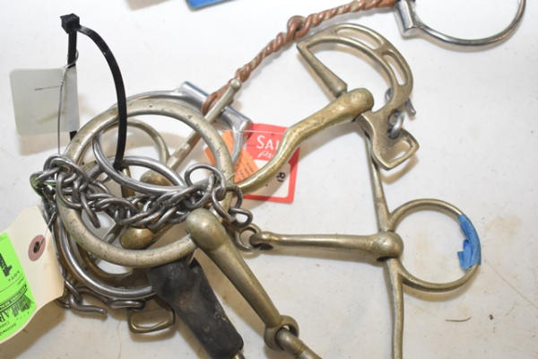 Lot of 5 5 1/4" English bits including a copper single twisted wire Kimberwick, rubber covered snaffle, large O-ring snaffle and a full cheek snaffle of the Never Rust steel