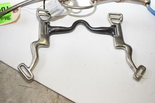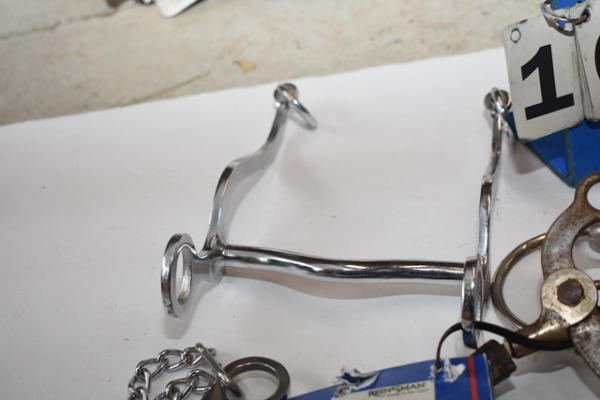 Lot of 5 bits including Leather covered hackamore, Reinsman new chain flyer, grazing bit, Sweet Iron grazing bit and an O-ring snaffle