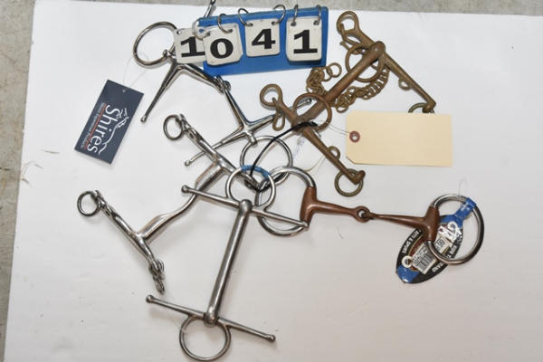 Lot of 5 5" bits including a copper Pelham, snaffle with a straight mouth (smooth on one side, rippled on the second side), fat mouth Pelham straight bar, copper roller and a New Shires foamer bit