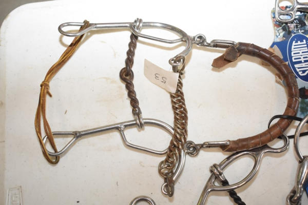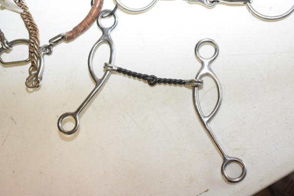 Lot of 5 bits including an aluminum engraved on the side shank grazing bit, French link dog bone loose ring snaffle, sweet iron mouth slider cow horse bit, a copper roller sweet iron mouth hackamore and a copper Tom Thumb