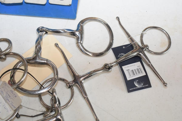 Lot of 5 5" bits including a new Shires foamer, double twist slow twist egg butt snaffle, straight mouth Pelham, slow twist snaffle and an English double ring driving bit with large O-ring for reins and small O-ring for check bit