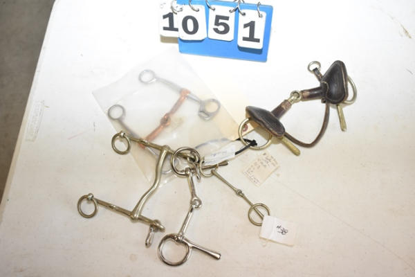 Lot of 5 4" bits including a Never Rust leather covered mouth piece with bit guard, a spoon bit for driving, jointed over check, Pelham with a low port and a copper mouth Tom Thumb snaffle bit