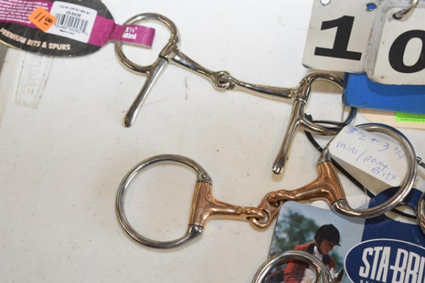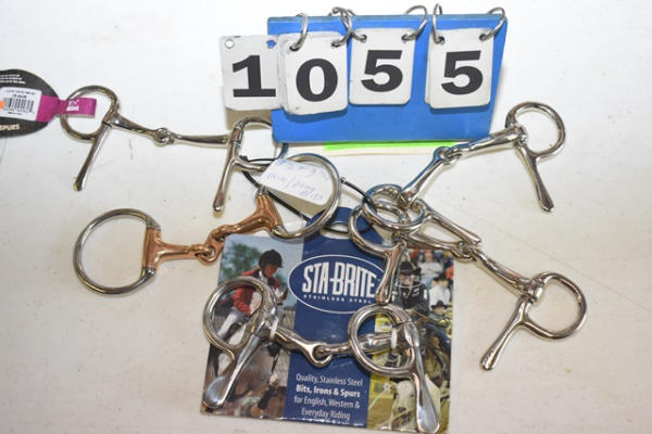 Lot of 5 3", 3 1/2", and 3 3/4" bits including a jointed mini driving bit, a French link copper mouth, 2 spoon driving bits, and a new Stay Bright spoon driving bit with fat mouth