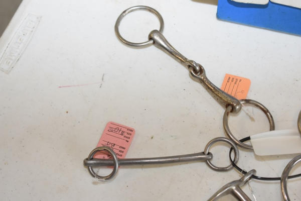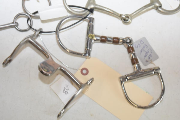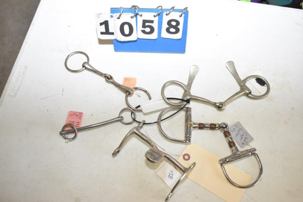 Lot of 5 4 1/2" bits including a copper roller that spins D-ring snaffle, Never Rust (stamped Made in England) spoon bit, O-ring snaffle, 4 1/2" with 3 1/2" shank solid port lolling bit and an over check