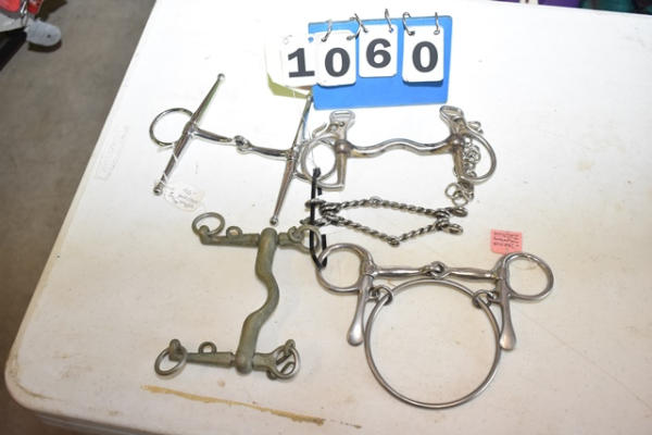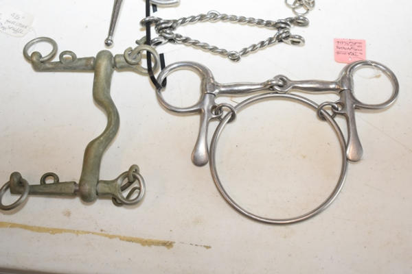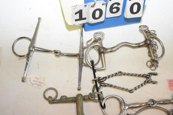Lot of 5 4 1/2" bits including a full cheek snaffle, a racing bit with the extra controller O-ring attached to it, a heavy (stamped Made in England) Pelham, a Kimberwick, and a mouth piece for a gag bit