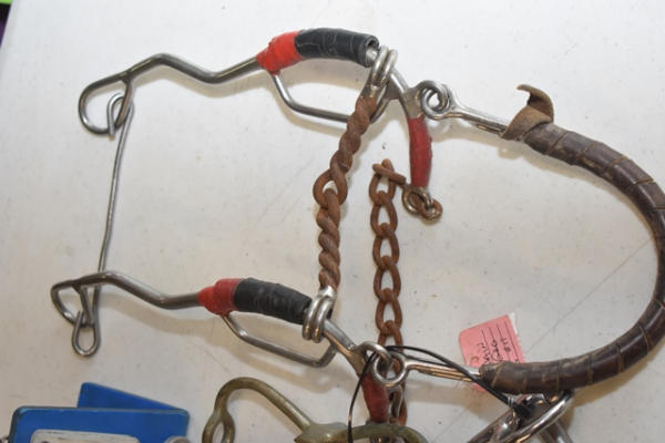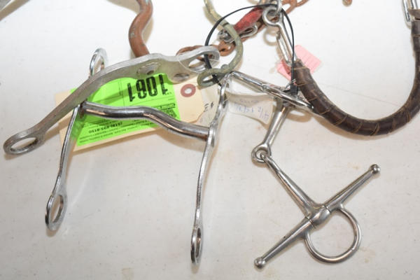 Lot of 5 4 1/2" and 4 3/4" bits including a chain mouth hackamore, a grazing bit, a full cheek snaffle, aluminum shank copper mouth western bit, and over check with high port lolling