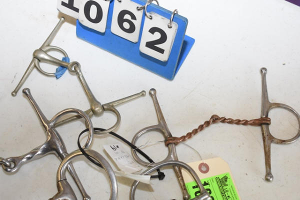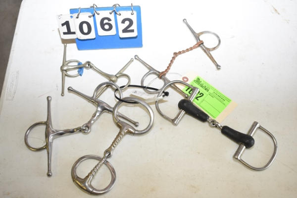 Lot of 5 4 3/4" bits including an egg butt slow twist, a rubber mouth d-ring, a full cheek copper twisted wire, a slow twist full cheek and a Never Rust (Made in England) full cheek snaffle