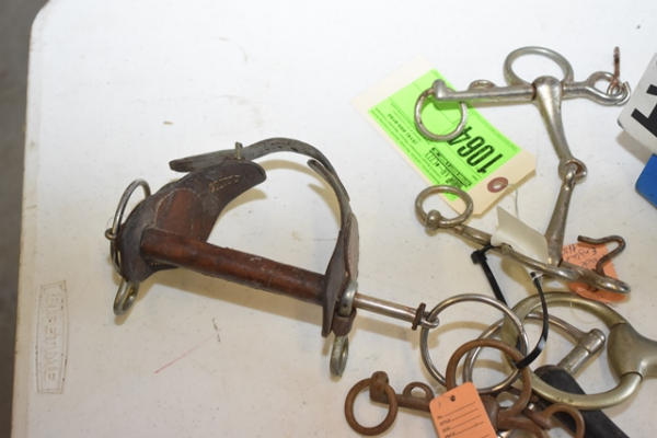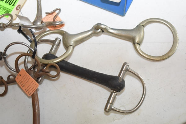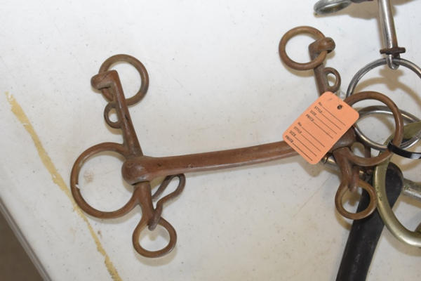 Lot of 5 4 3/4" bits including a leather covered bit with outside slider rings, a soft mouth d-ring snaffle, an antique finish copper Pelham, Never Rust very fat mouth English snaffle, and a Pelham