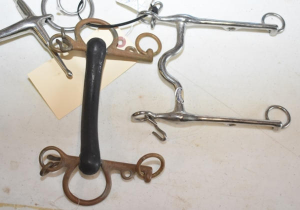 Lot of 5 4 3/4" bits including a Korsteel long shank corded bit, a hard mouth rubber covered Pelham, a d-ring snaffle, a foamer and an over check