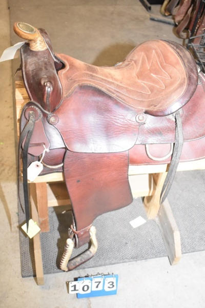 15" seat, 6" gullet, leather saddle with suede out seat and tie string buckle