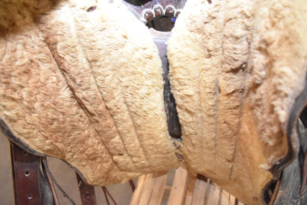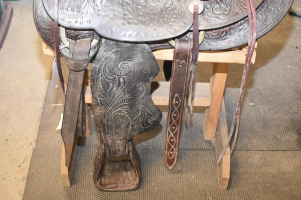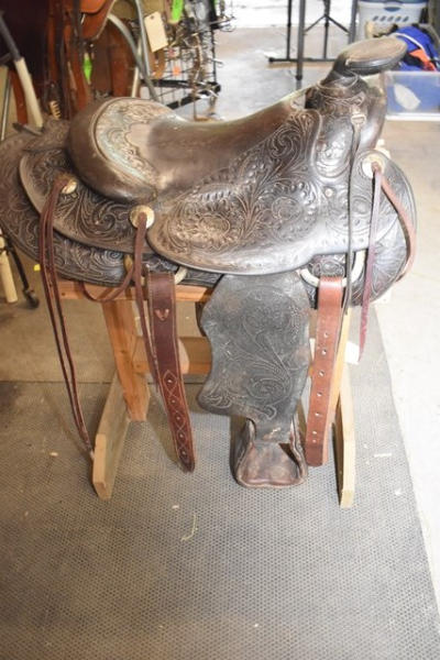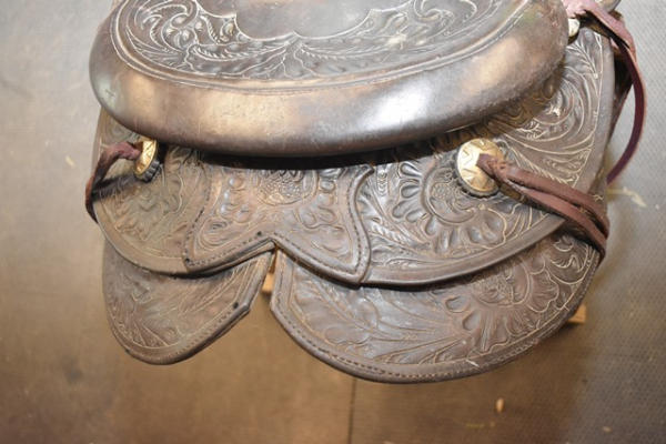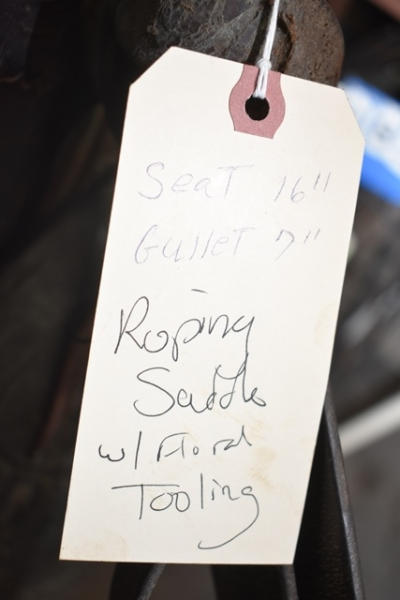 16" seat, 7" gullet, heavy duty roping saddle with floral tooled designs, leather covered Blevin buckles, matched floral tooled stirrups