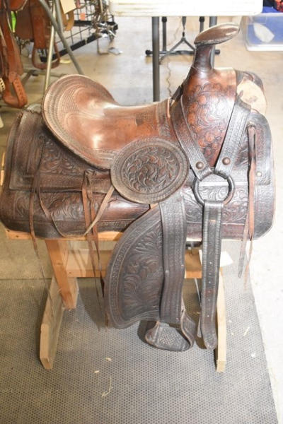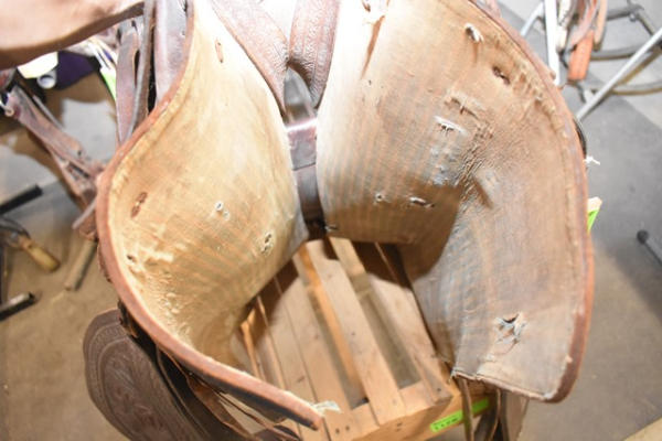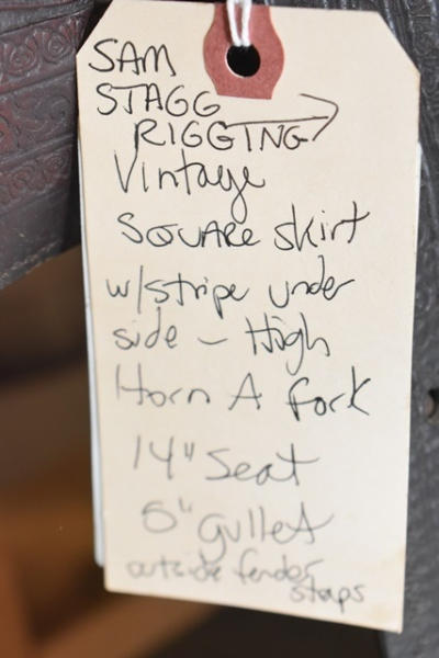 Saddle, Sam Stag rigging vintage square skirt with stripe underside, high fork, A fork, 14" seat, 5" gullet, outside fender straps, a unique piece