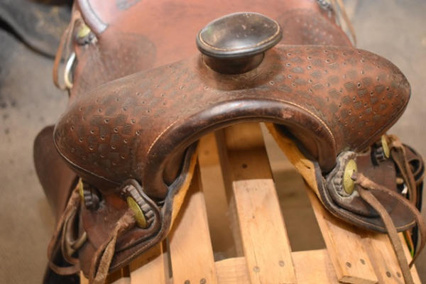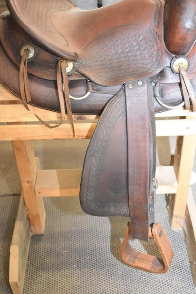 Famous Jumbo Brand saddle with 14" seat, 5" gullet, #568 stamped on it, outside fender straps and a wide swell, Sohoeukoff, Made in USA, with antique wooden stirrups