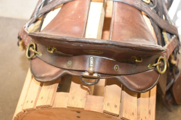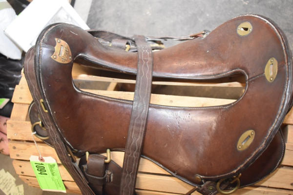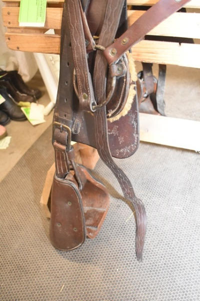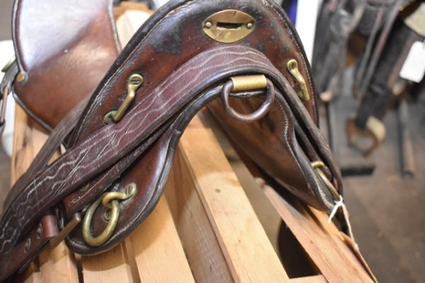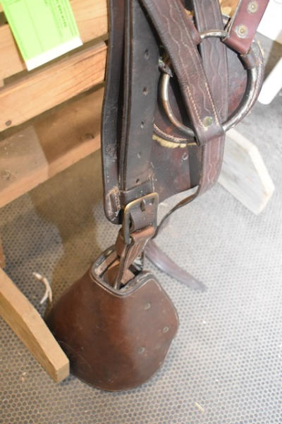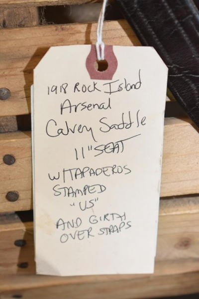 1918 Rock Island Arsenal Calvary Saddle, 11" seat with tapaderos, it is stamped "US" and it has girth and over straps included, brass fittings, curved high back seat, open gullet