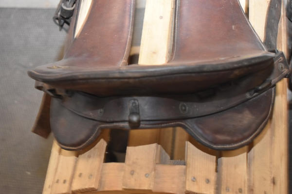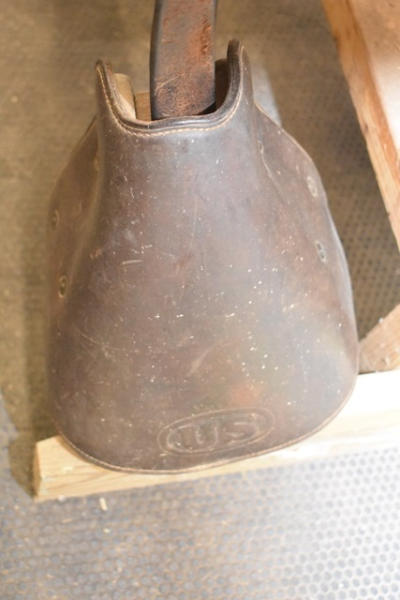 11 1/2" seat Calvary saddle, stamped "DFBCO", has girth strap and left side has "US" stamped on the tapaderos, open gullet, high back, used mostly for military