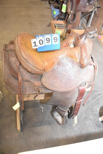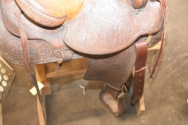 Hereford saddle with 15" seat, 6" gullet, floral tool design, padded seat saddle, leather covered tooled stirrups, with matching fenders and Blevin buckles