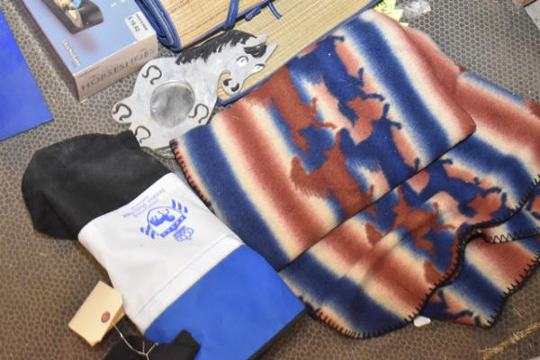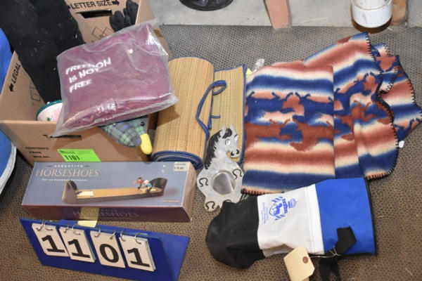 Box lot with Executive Horseshoe Game, winter glove and hat set, black door draft, Friesian tote bag, flower planter, duck door draft, 2 throw rugs (1 with horses), and a fold out rattan mat