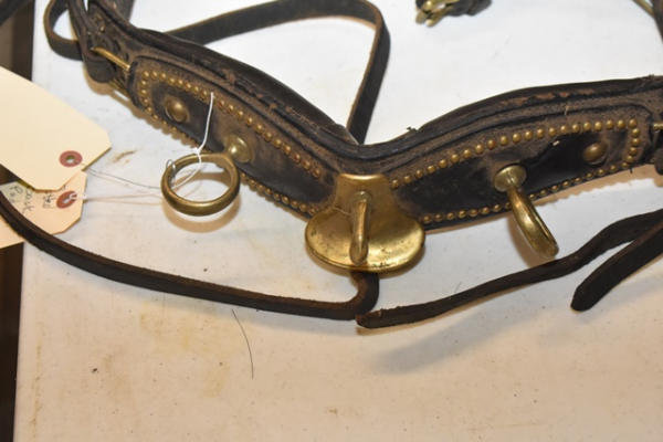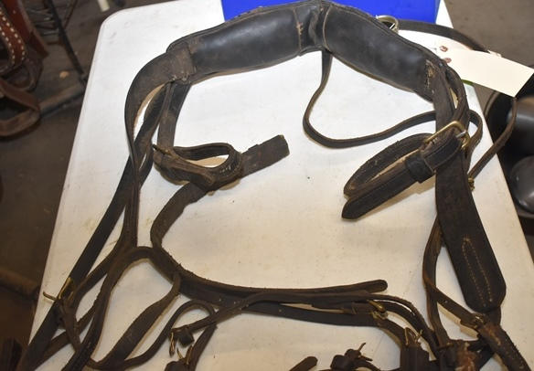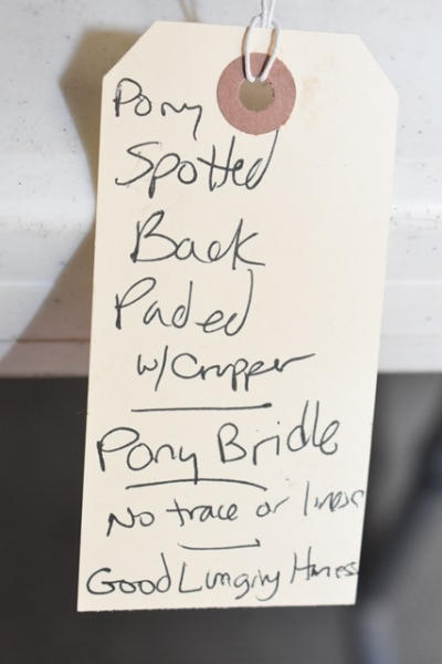 Pony spotted back pad with crupper, pony bridle, does not have traces or lines, but it makes a good lunging harness, has brass fittings