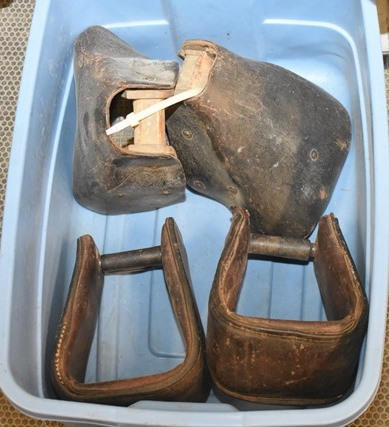 Tote with floral parade tapaderos, black plain design tapaderos, 1 pair of extra wide leather stirrups