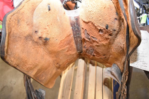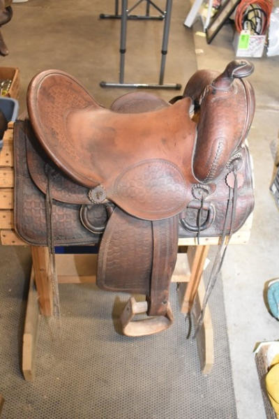 Deep seat 14" saddle seat, 6" gullet, vintage, round, rose pattern with a A fork and outside fenders, straps and leathers with covered ring billets and wooden stirrups, double rigged with the outside stirrup leathers, antique wood stirrups