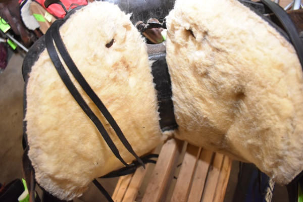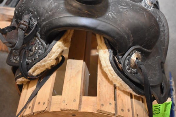 Hillmaker nice heavy weighted, vintage saddle, 14" seat, 5" gullet, metal lined mahogany stirrups with Blevin buckles and double rigged with a round skirt