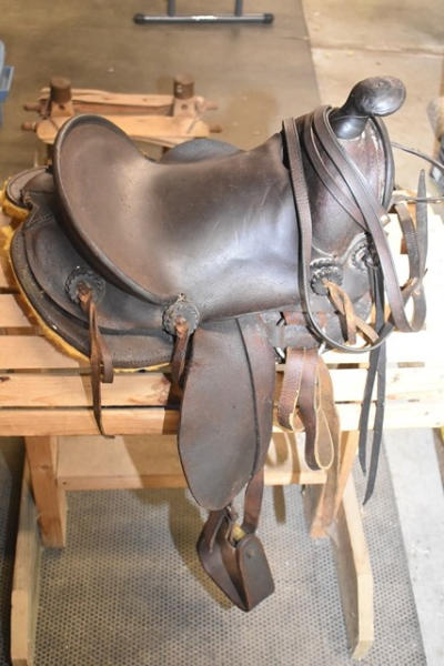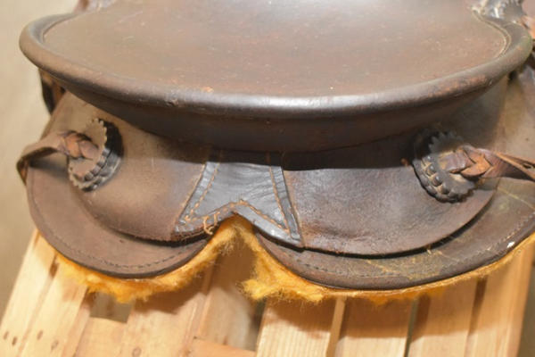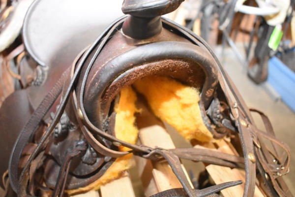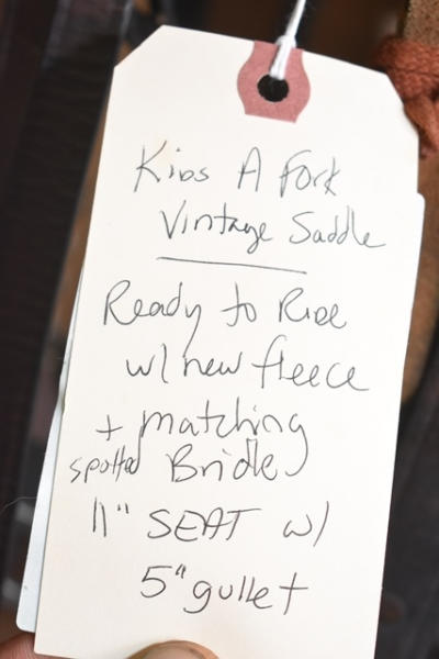 Kid's A fork vintage saddle, ready to ride with new fleece, has a matching bridle that is spotted, 11" seat with 5" gullet, cute kid's saddle
