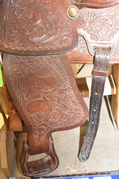 Western seat saddle, 15" seat, 6" gullet, has horsehead design stamped into the fenders, saddle is by Western Saddlery with Big W Performance Line #1200, has Blevin buckles and matching stirrups