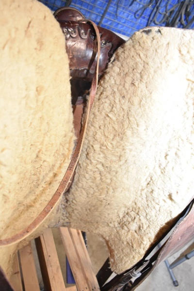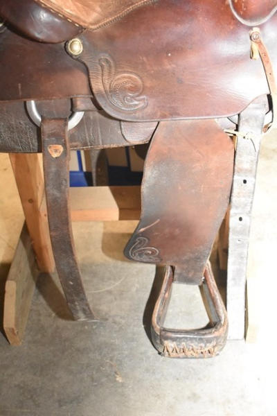 Longhorn roping saddle, #773, 16" seat, 7" gullet, has scallops type minimal trim, big strong saddle horn and a suede out padded seat with leather covered Blevin buckles