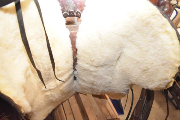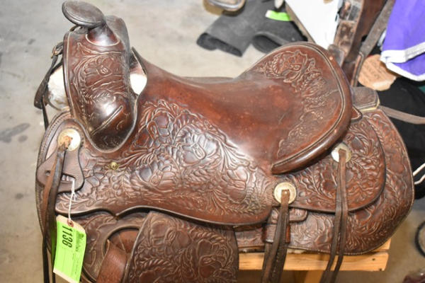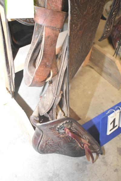 Floral tooled saddle with old tapaderos, heavy duty, vintage older saddle, probably from the 1940s or 1950s, has floral scallop trim and good fleece