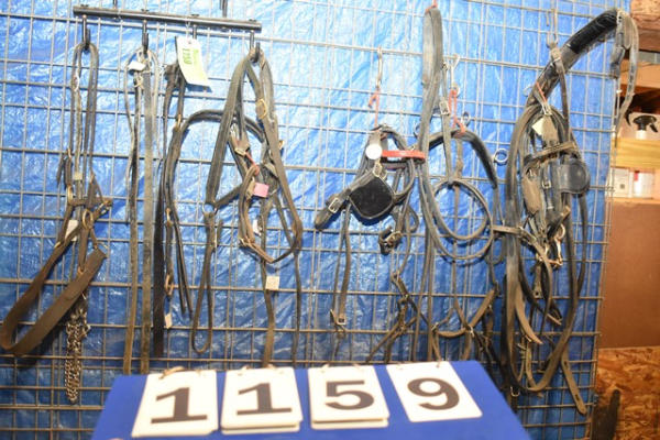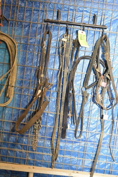 Tack lot including miniature horse size spare parts including britching, lead chains, tie backs, set of traces, belly band, a couple different bridles (1 with red brow band, 1 with round D-ring shape), 2 small back pads