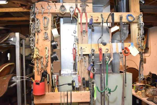 Lot including double ended snaps, quick links, brass double snaps, a few screwdrivers, some tack hooks, some misc. chains, tape, electrical tape, hoof picks, pliers, some tie back straps, some screw eyes, fence pliers, etc.