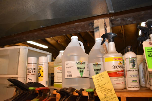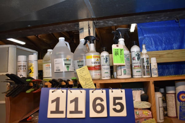 #1165 – Lot of 10 blanket clips and cleaning products including Leather Sheen, Saddle Lac, bottles of ammonia, 2 gallons of mineral oil, Show Sheen, Cowboy Magic, 2 bottles of detangler, 3 bottles of Cowboy Magic Green Spot Removal, 1 bottle of Shine In, 1 bottle of Body Shine and a roll-on repellent