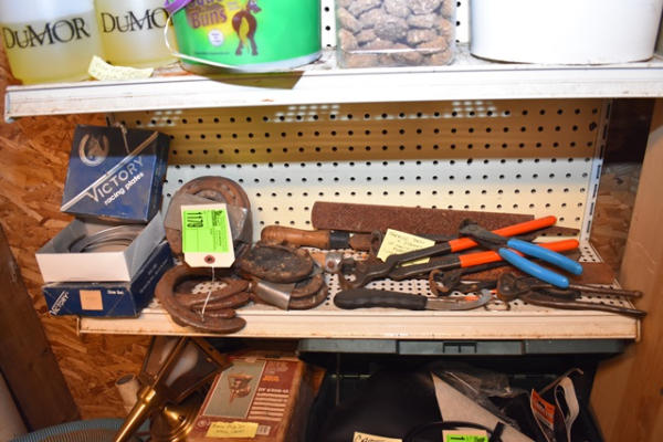 Victory Racing Plates, brand new, 2 sets of Cobb/Horse size shoes, small set of mini/Shetland pony size (3 have pads, 1 does not), and farrier tools including rasps, nippers, cutters, hook knife, etc.