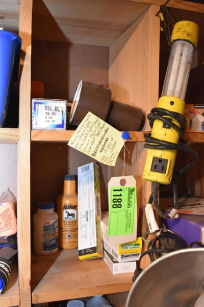 50mm farrier nails, brown clip on light, yellow work light that can be hung, aluminum clip on light (large), Super Fast Hoof Repair, new 18 rolls of Coflex, Absorbine, and paste wormer (not expired)