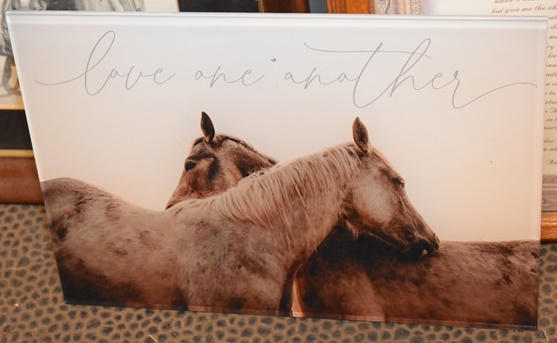 Lot of 3 photos including 1 with a cowboy feeding a horse an apple (13" x 15"), The Horsemanship Prayer (12" x 10"), an acrylic with Love Each Other (12" x 8)