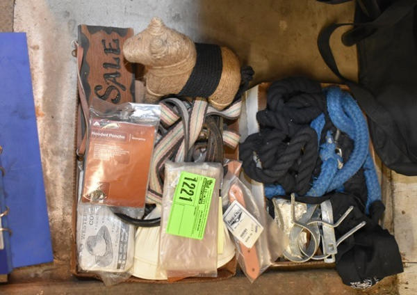 Misc. collection including 2 tote bags, fence hangers, heavy lead ropes, lunge line, Bell boots, western hat covers (all new), new rain poncho covers, for sale sign carved out of wood to hang on stall door and a string horse nail art.