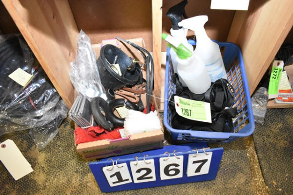 Lot of assorted stall signs with stall latch hardware, chain curbs, straps, boil donuts and misc. fleece for halters, slip-on spurs, etc.