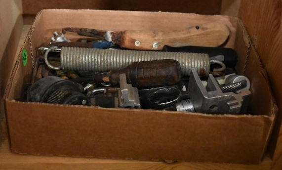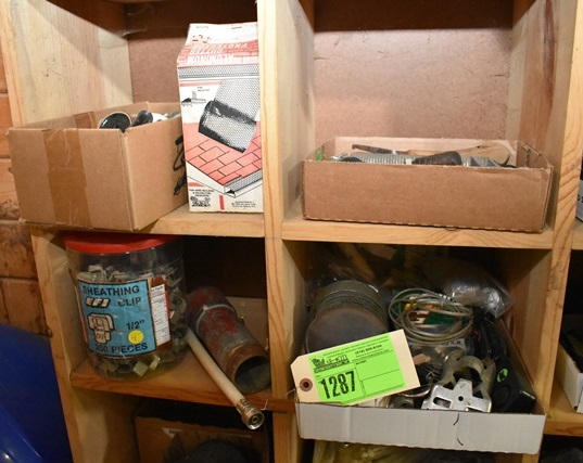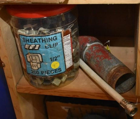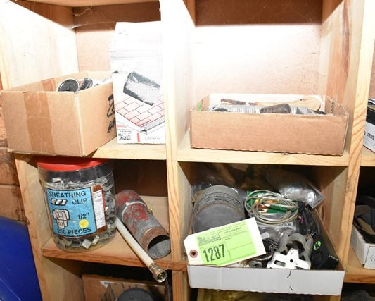 Contents of 4 cubbies including sheeting clips, assorted peg hook hardware, assorted hand tools, assorted pipe, etc.