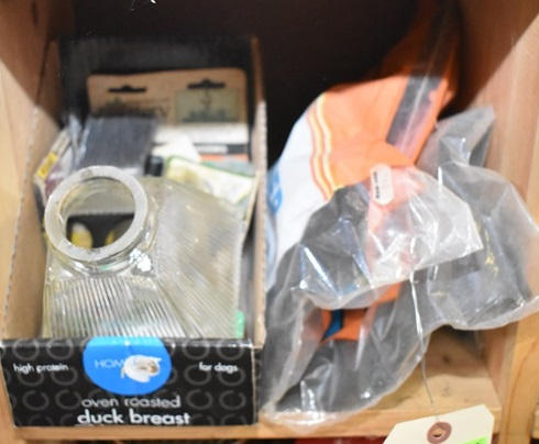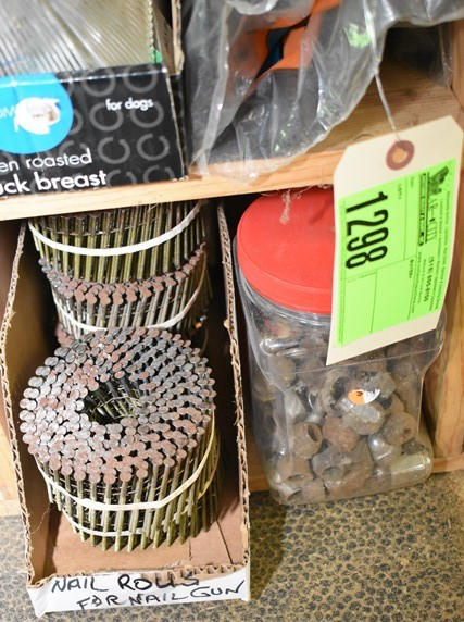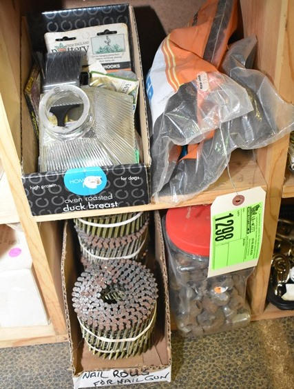 Contents of 2 cubbies consisting of nail rolls for nail gun, assorted hooks, brush, nails, etc.