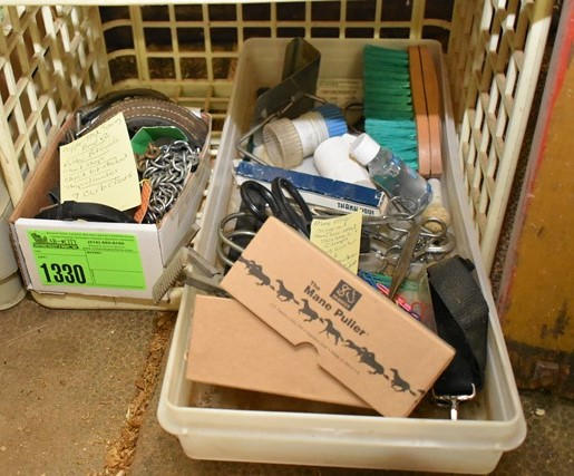 Copper tack training bands, rubber bit guards, check straps, check bit attachments, strap with conchos and 9 curb chains, mane pullers, surgical stainless steel scissors and clamps, 2 pill crushers, brush, hand sanitizer, misc. snaps, etc.