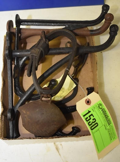 Lot of 3 10" large cast iron hooks, 1 5" hook, 1 4" hook and 1 old cow bell