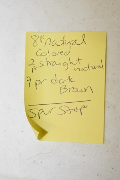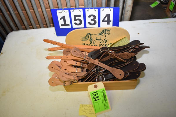 Lot of spur straps in a wooden Soapie Ponies box including 8 piece natural color, 2 piece straight natural, 9 pair dark brown.